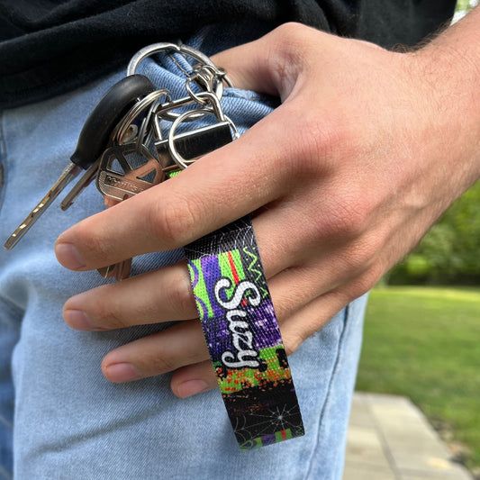 Custom Spiderwebs Halloween Nylon Keychain Wristlet - Personalized Spooky Season Accessory with Grungy Font Text for Keys, Backpacks, or Purses