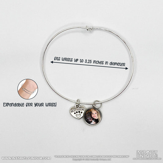 Personalized Photo Charm Adjustable Silver Bracelet with Best Friend Paw Print Pet Charm