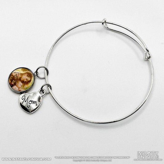 Customizable Mom Heart Charm Silver Bracelet with Personalized Photo Charm