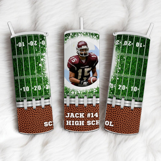 Personalized 20oz Tumbler with Football Field Background, Custom Photo, and Text - Perfect Gift for Sports Fans