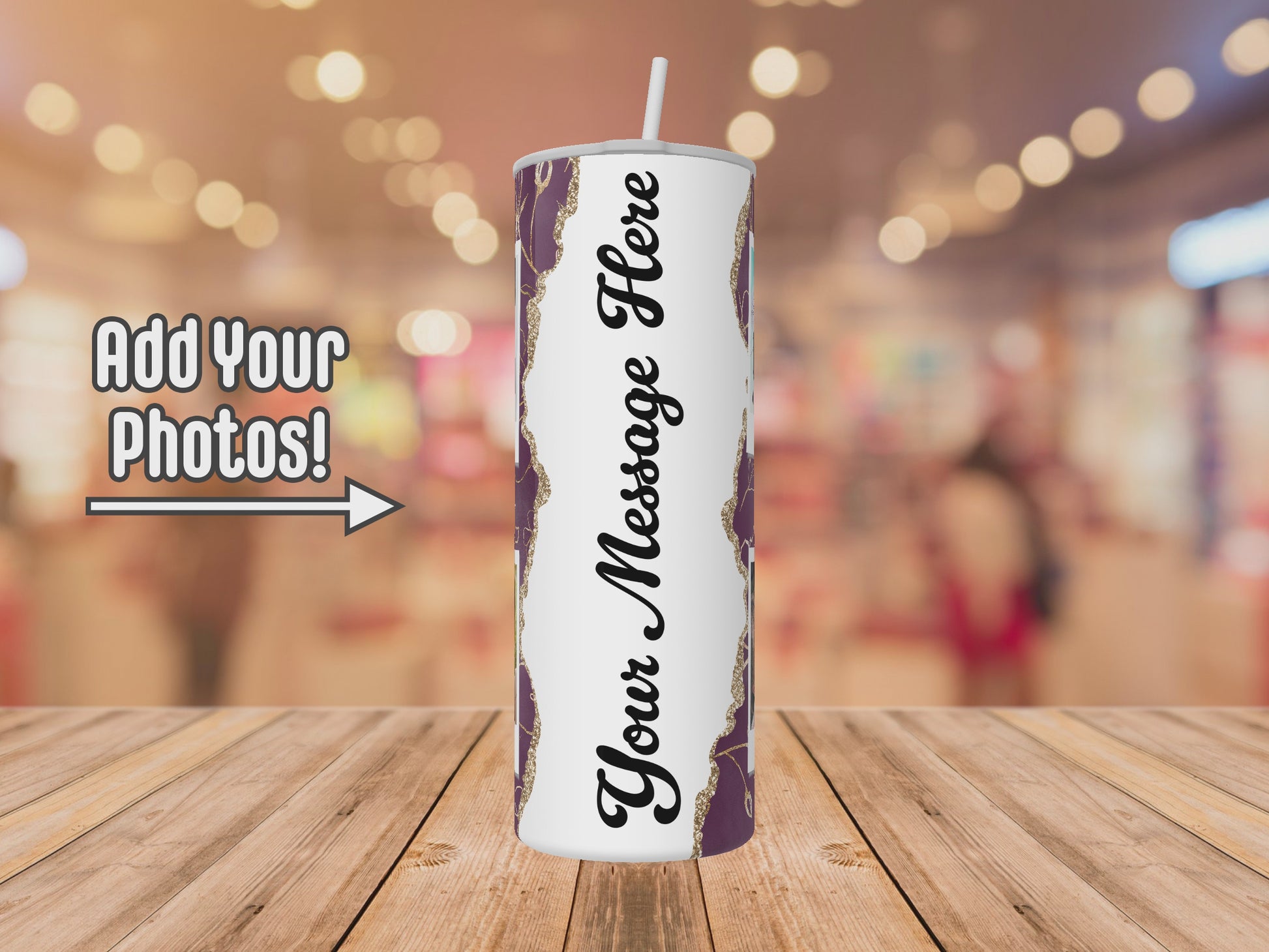 Stay hydrated in style with our 20oz skinny tumbler! This stainless steel tumbler features a beautiful Purple with Gold Flowers design, and can be customized with 4 of your photos for that personal touch. Whether you're on the go or lounging at home, this tumbler will keep your drinks at the perfect temperature, and its slim design makes it easy to take with you wherever you go.